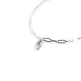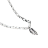 This hand-strung bracelet features 925 sterling silver beads paired with a stainless steel chain, finished with a rhodium-plated brass feather pendant. The bracelet measures 6.7 inches in length, with a 1.3-inch extension for adjustable fit.