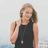Hand-woven 2" pendant with 18K gold-plated stainless steel and black glass beads on 18K gold-plated stainless steel chain. 32" with 1.3" extension chain. #N274G.