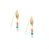 1.6" drop earring featuring faux coral, natural malachite, and brass beads, accented with a freshwater pearl suspended from the pendant. Crafted from 18K gold-plated stainless steel, this earring features a 316 medical-grade, 18K gold-plated stainless steel threader.
