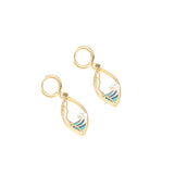 18K gold-plated stainless steel 1.1" pendants with 1.1" blue and white wave enamel pendants on 0.5" 18K gold-plated stainless steel hinged huggie hoops. #E323G.