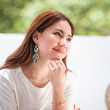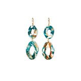 Handmade polymer clay 2.7"H x 1"W earrings in mixed teal color with gold foil on 18K gold-plated sterling silver hooks. #E330G.